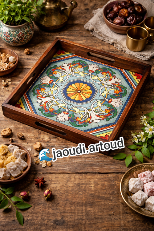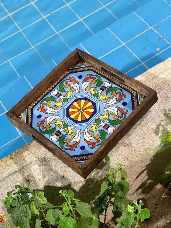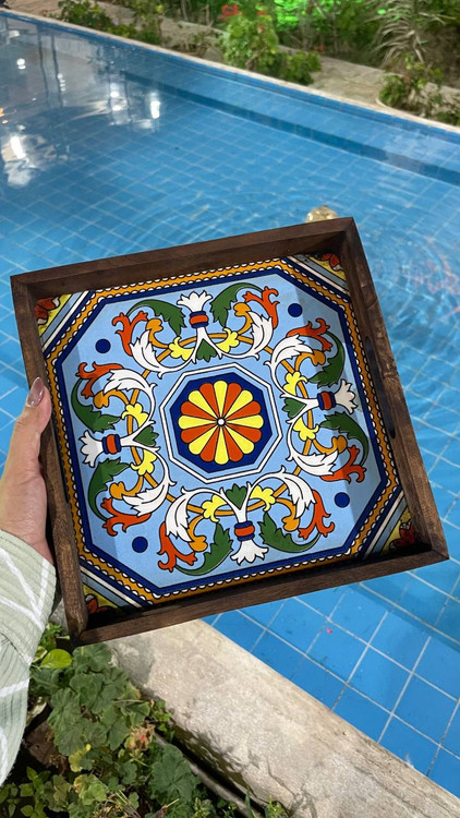 سینی چوبی دست‌ساز با کاشی سنتی